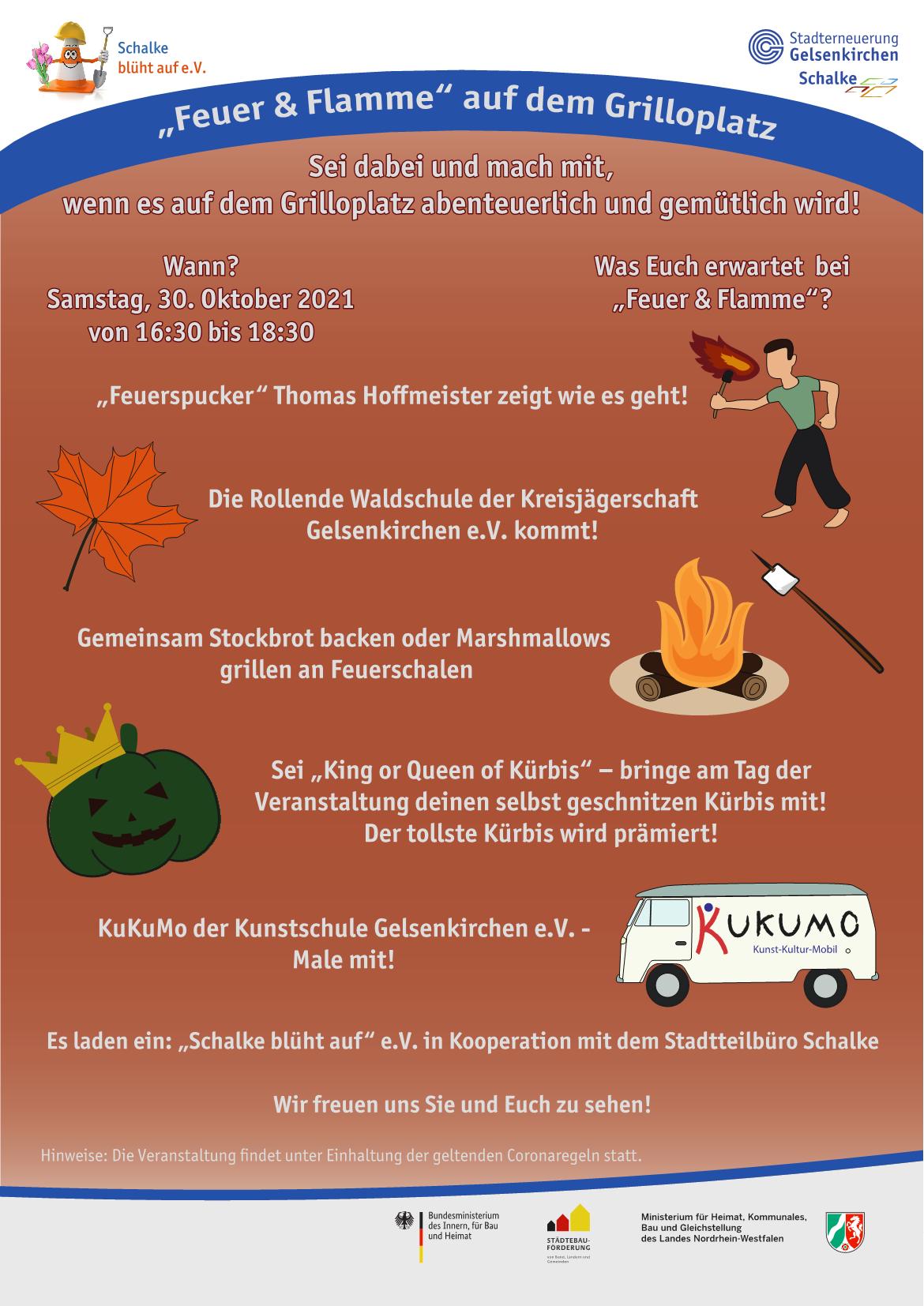 In Kooperation mit „Schalke blüht auf“ und weiteren Akteuren findet am Samstag, 30.10.2021, in der Zeit von 16:30 Uhr – 18:30 Uhr die Veranstaltung „Feuer und Flamme“ auf dem Grilloplatz in Schalke statt.