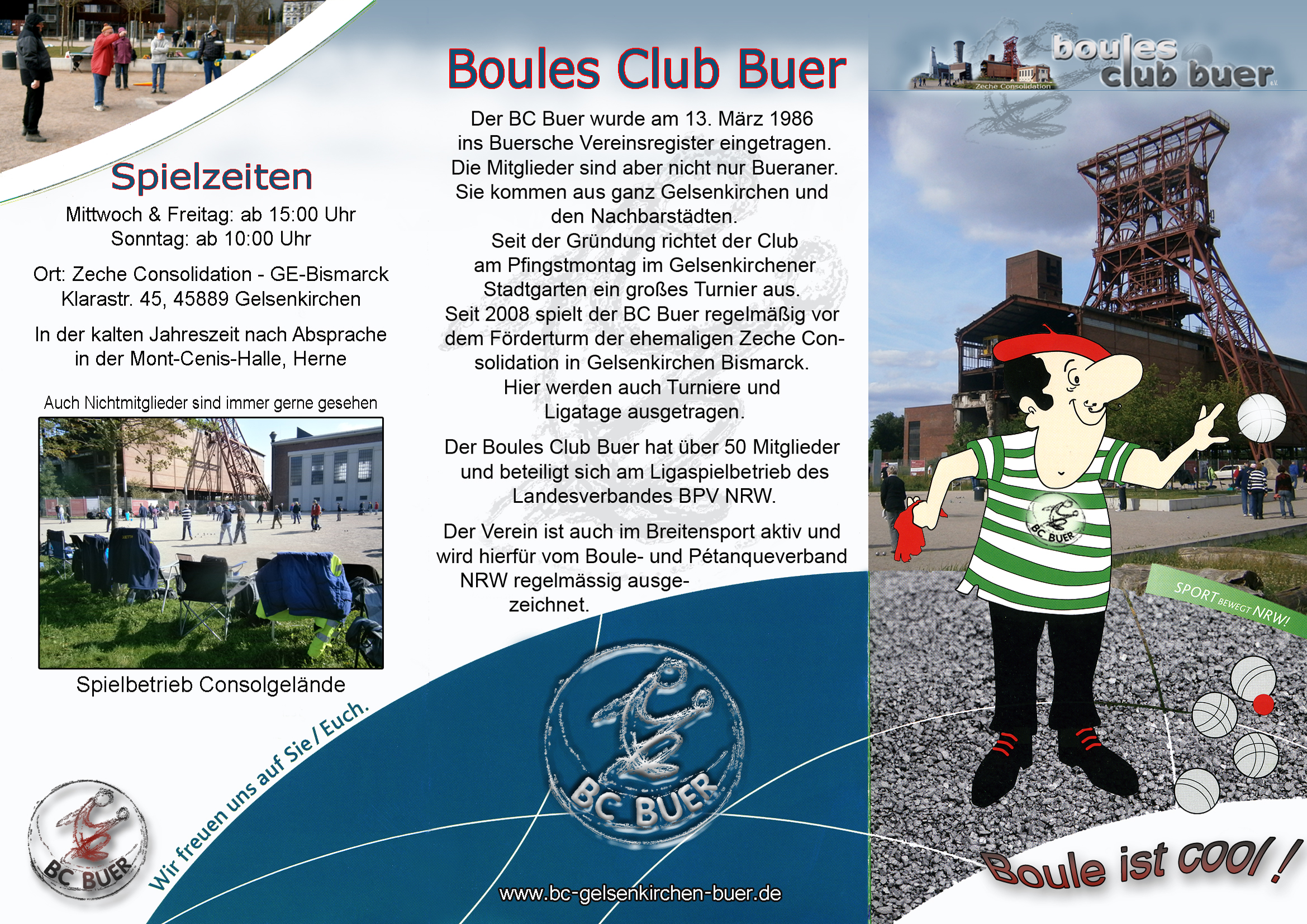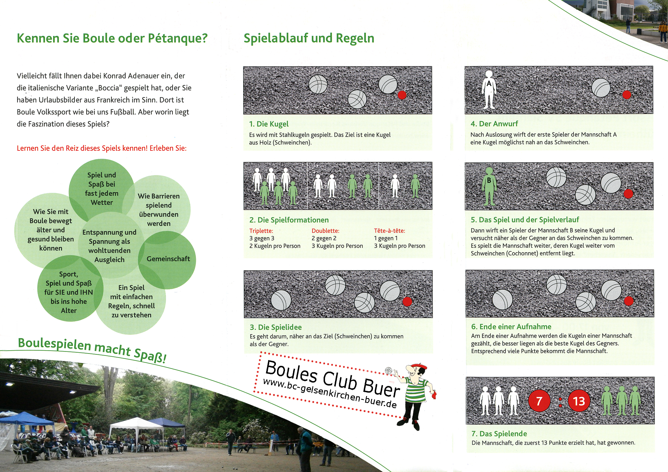 Anbei erhalten Sie den Flyer des Boule-Club-Buer, um sich schon vorab in die Geheimnisse des Boulespiels einzulesen und Ihre Kenntnisse noch etwas aufzufrischen.
