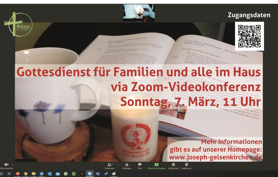Am Sonntag, 7. März, um 11 Uhr lädt die Pfarrei St. Joseph zum Zoom-Gottesdienst ein! Dank der vielfältigen Möglichkeiten von Zoom wird er gleichzeitig für Kinder, Familien und Erwachsene vorbereitet.