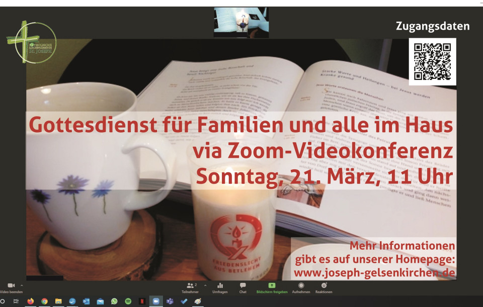 In der Pfarrei St. Joseph werden seit dem 14. März wieder Präsenzgottesdienste gefeiert. Dies stellt für den Pfarrgemeinderat jedoch keinen Grund dar, die Zoom-Gottesdienste einzustellen, so ist ein nächster für den 18. April terminiert.