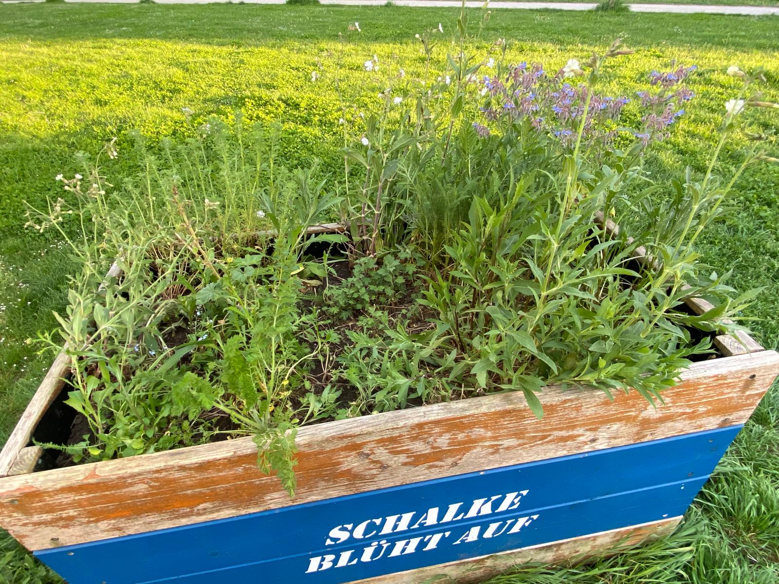 Hochbeet in der Siedlung an der Rheinischen Strasse, am Ende der Spitzahornstrasse, Richtung Bahngleise