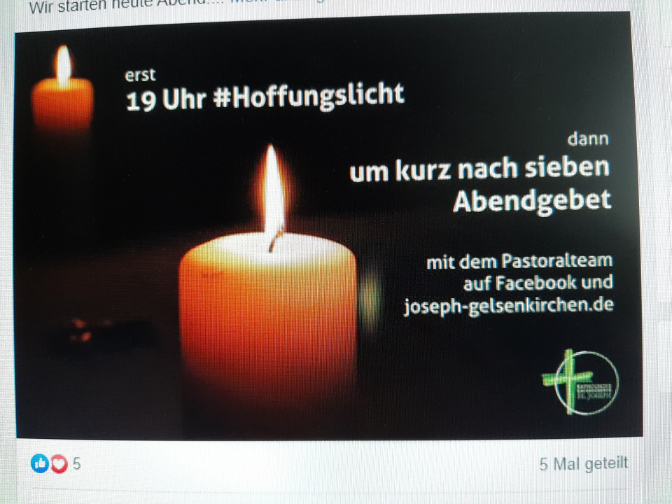 Aktuelles | 27. März 2020 Hoffnungslicht in diesen Zeiten Suche im Internet Browser: Facebook # joseph-gelsenkirchen