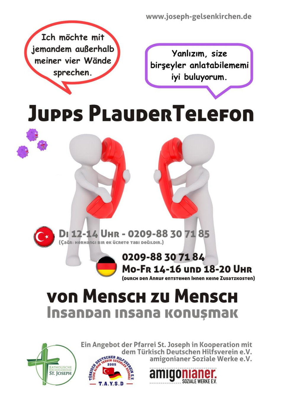 Mit „Jupps Plauder-Telefon“ bietet die Pfarrei St. Joseph – in Kooperation mit dem Türkisch Deutschen Hilfsverein und den Amigonianern – Menschen während der Corona-Krise eine Möglichkeit, auch in der häuslichen Umgebung wieder mit anderen Leuten in Kontakt zu kommen. Wer gerade das Haus nicht verlassen kann oder darf, allein ist, sich einsam fühlt, oder einfach mal mit einer anderen Person außerhalb der eigenen Familie sprechen möchte, findet bei „Jupps Plaudertelefon“ offene Ohren und interessierte Gesprächspartner*in.