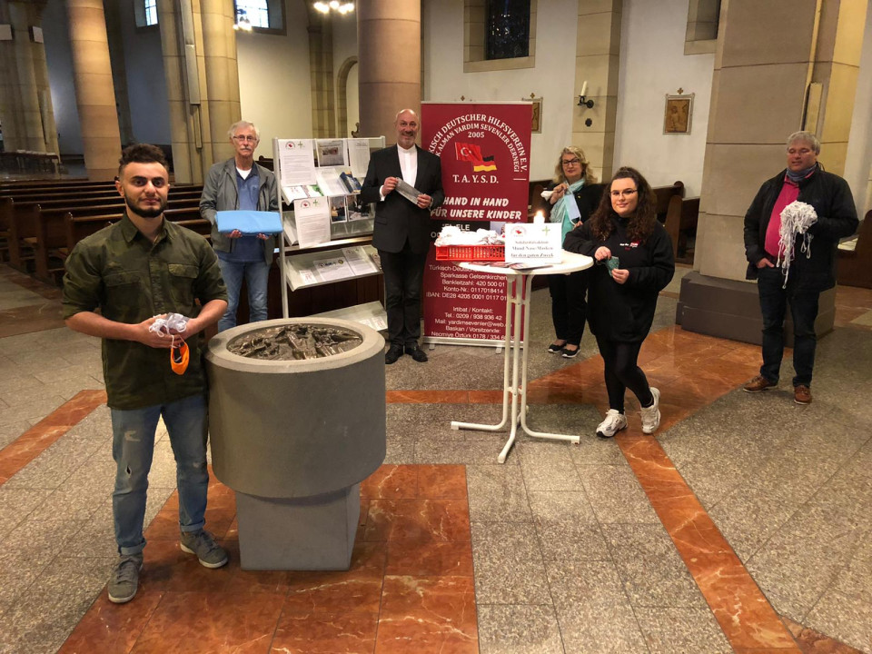 übergaben am 29.04.2020 in der Pfarrkirche St. Joseph jungen Geflüchteten des Café Vielfalt (ein Angebot des DGB im DGB Haus der Jugend) 60 selbstgenähte Mund-Nase-Masken. Als Dankeschön übergaben einige der Jugendlichen Gummiband zum Nähen weiterer Mund-Nase-Masken für die Menschen in Gelsenkirchen.
