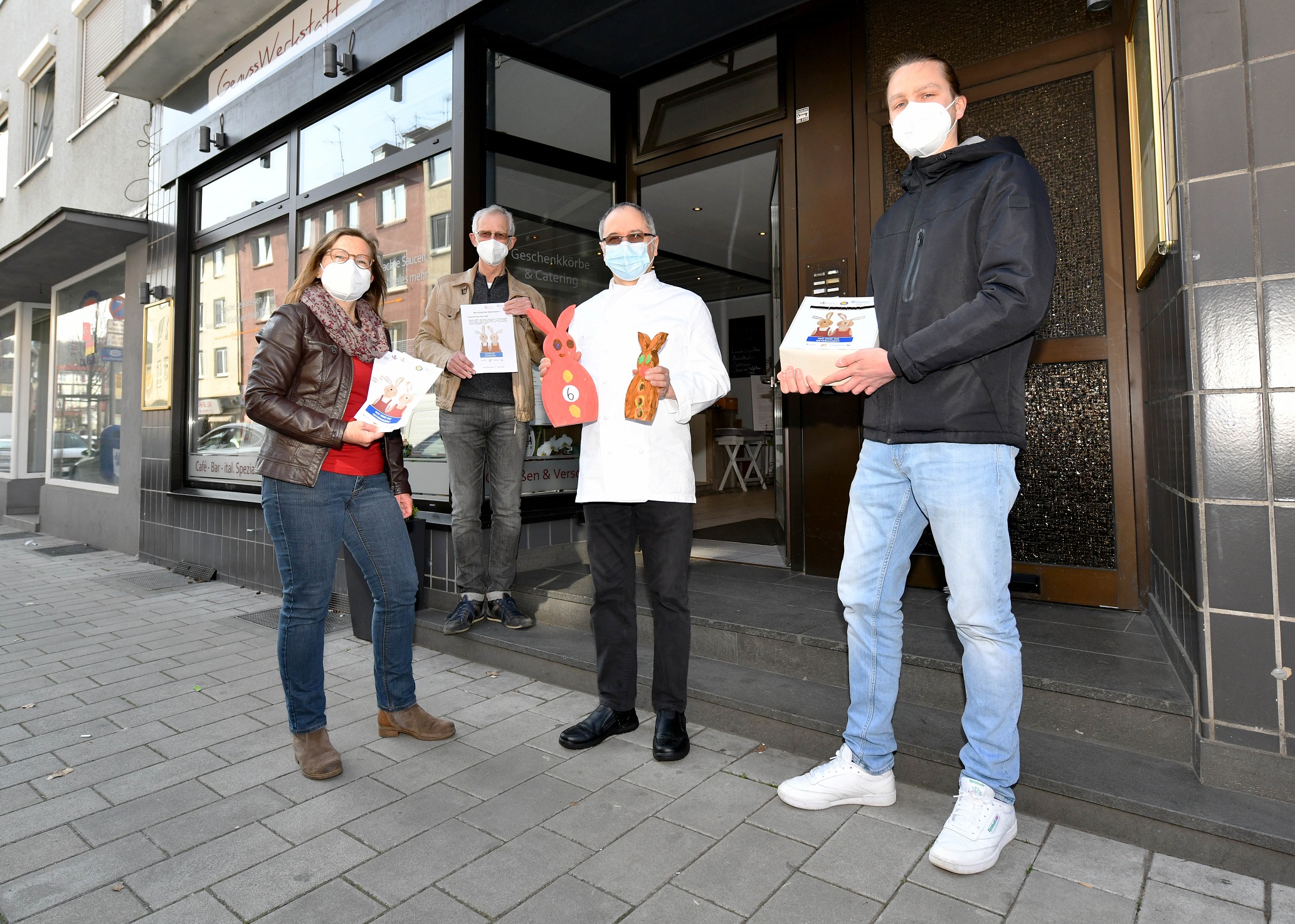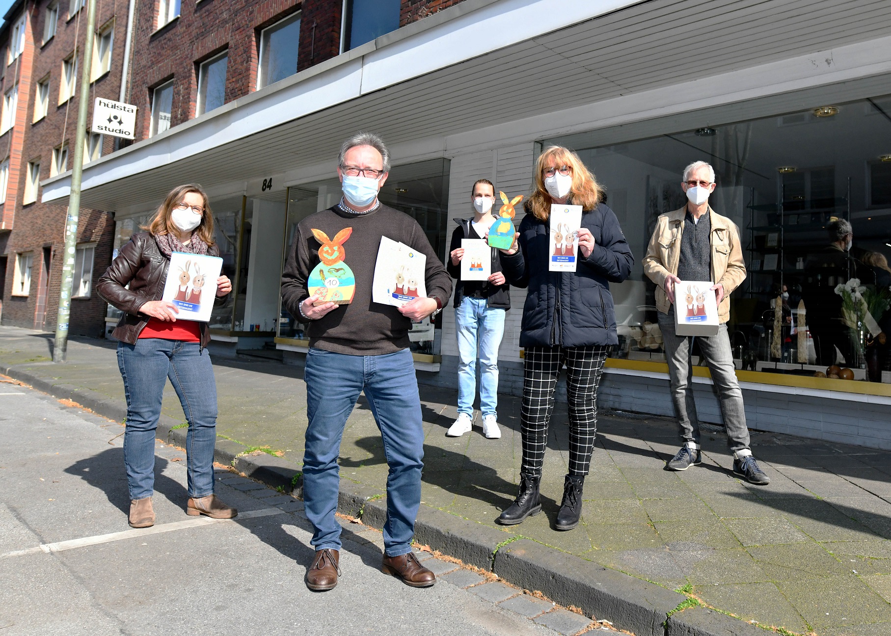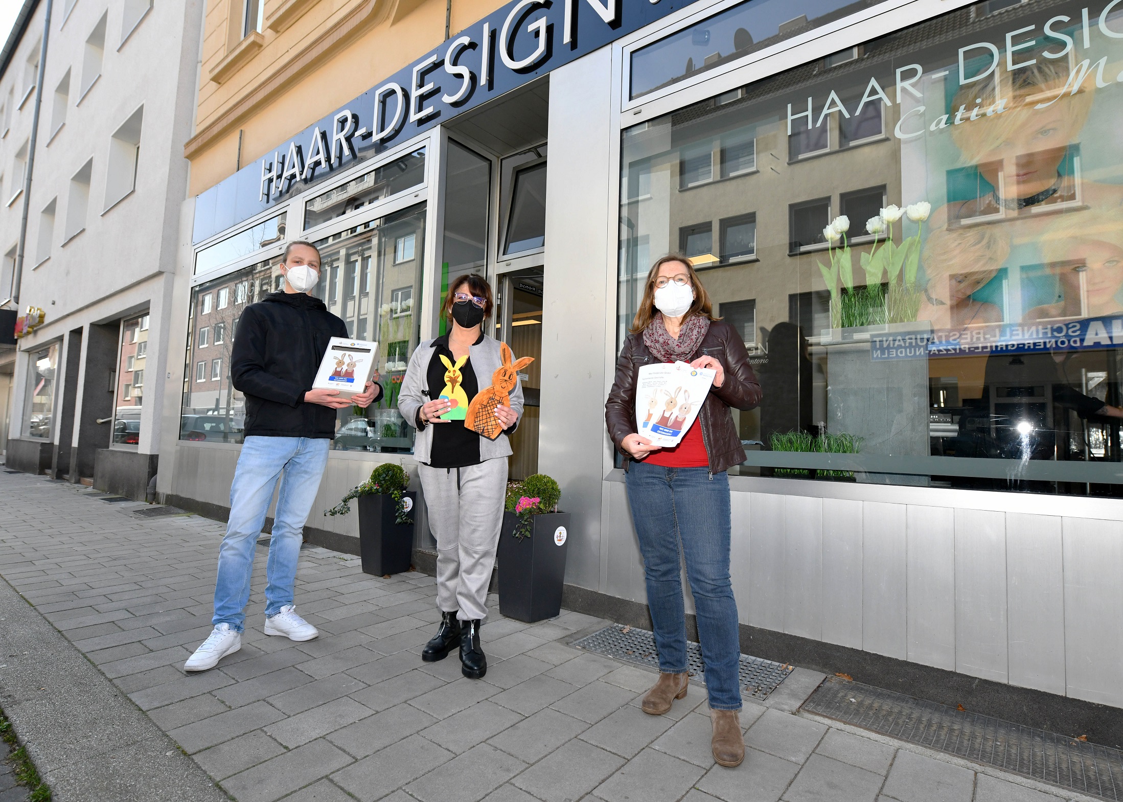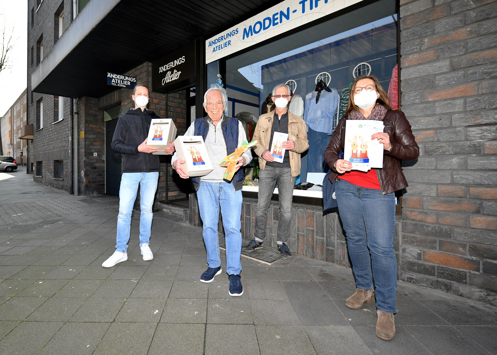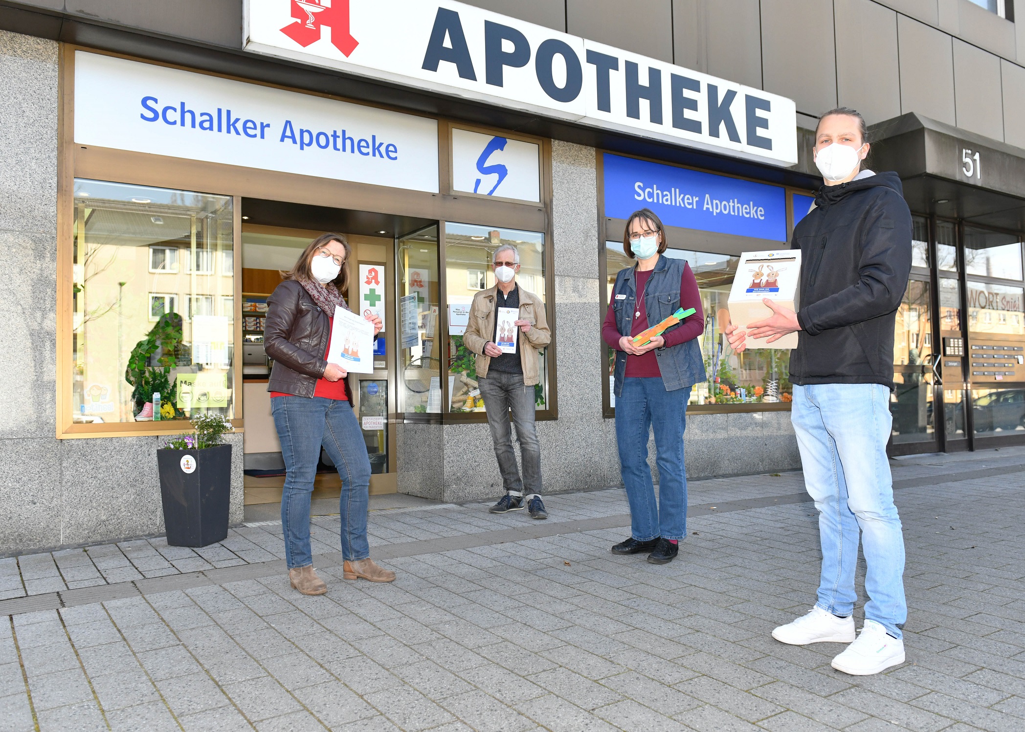 Zum Start der Aktion überreichten am Mittwoch, 24. März um 12 Uhr Vertreter*innen von „Schalke blüht auf“ und Stadtteilbüro Schalke ein Osterhasenpärchen stellvertretend für alle teilnehmenden Geschäftsleute an Michael Mette vom Einrichtungshaus Mette Schalker Str. 80-84. Aufgrund der Coronasituation findet die Übergabe mit reduzierten Teilnehmenden und selbstverständlich unter Einhaltung der geltenden Vorschriften statt.