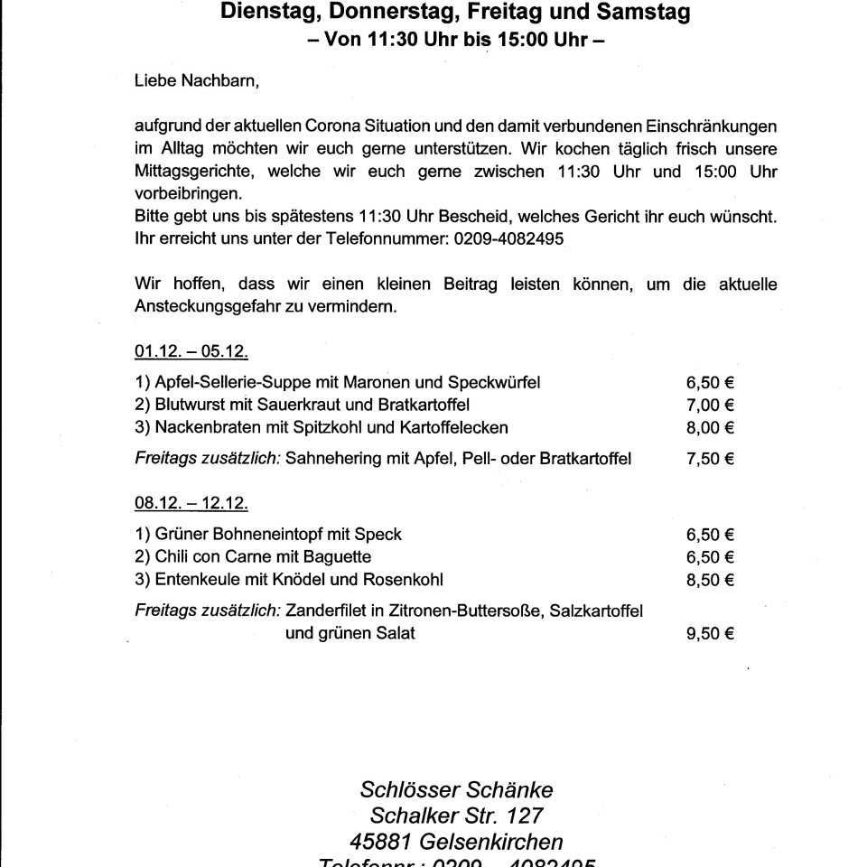 Schlösserschänke Mittagstisch mit Lieferservice Dezember