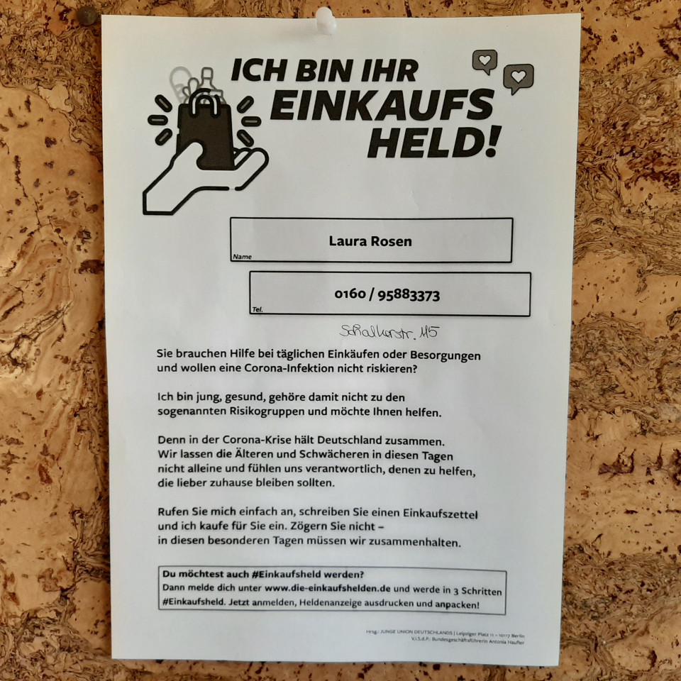 Ich heiße Laura Rosen und gehöre zu den Einkaufshelden, die in dieser Zeit den gefährdeten Menschen beim Einkaufen helfen wollen. Wir suchen auch noch weitere Einkaufshelden. Bitte informiert Euch unter die-einkaufshelden.de Dort kann man auch die Flyer...→ weiter lesen -