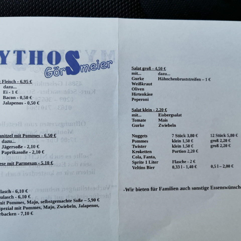 Mythos Görsmeier 45881 Gelsenkirchen Kurt-Schumacher Strasse 65 0209 - 36658721 0163 - 7101904 Öffnungszeiten zum Bestellen* Montag bis Samstag 17:00 bis 22:00 Uhr sollte es Euch nicht möglich sein, das Essen selber abzuholen, liefern wir es kostenfrei nach...→ weiter lesen -