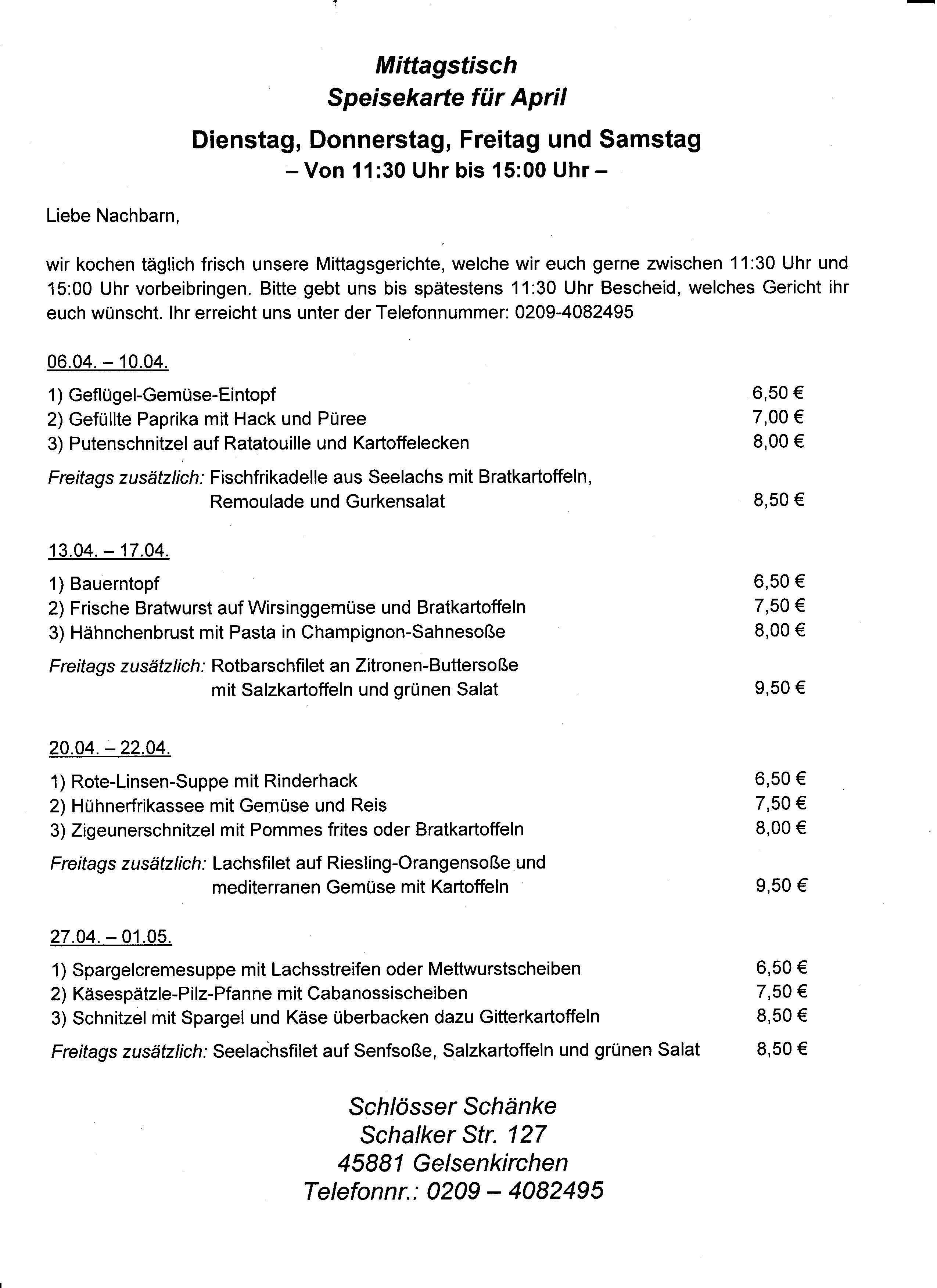 Schlösserschänke Mittagstisch mit Lieferservice 0421