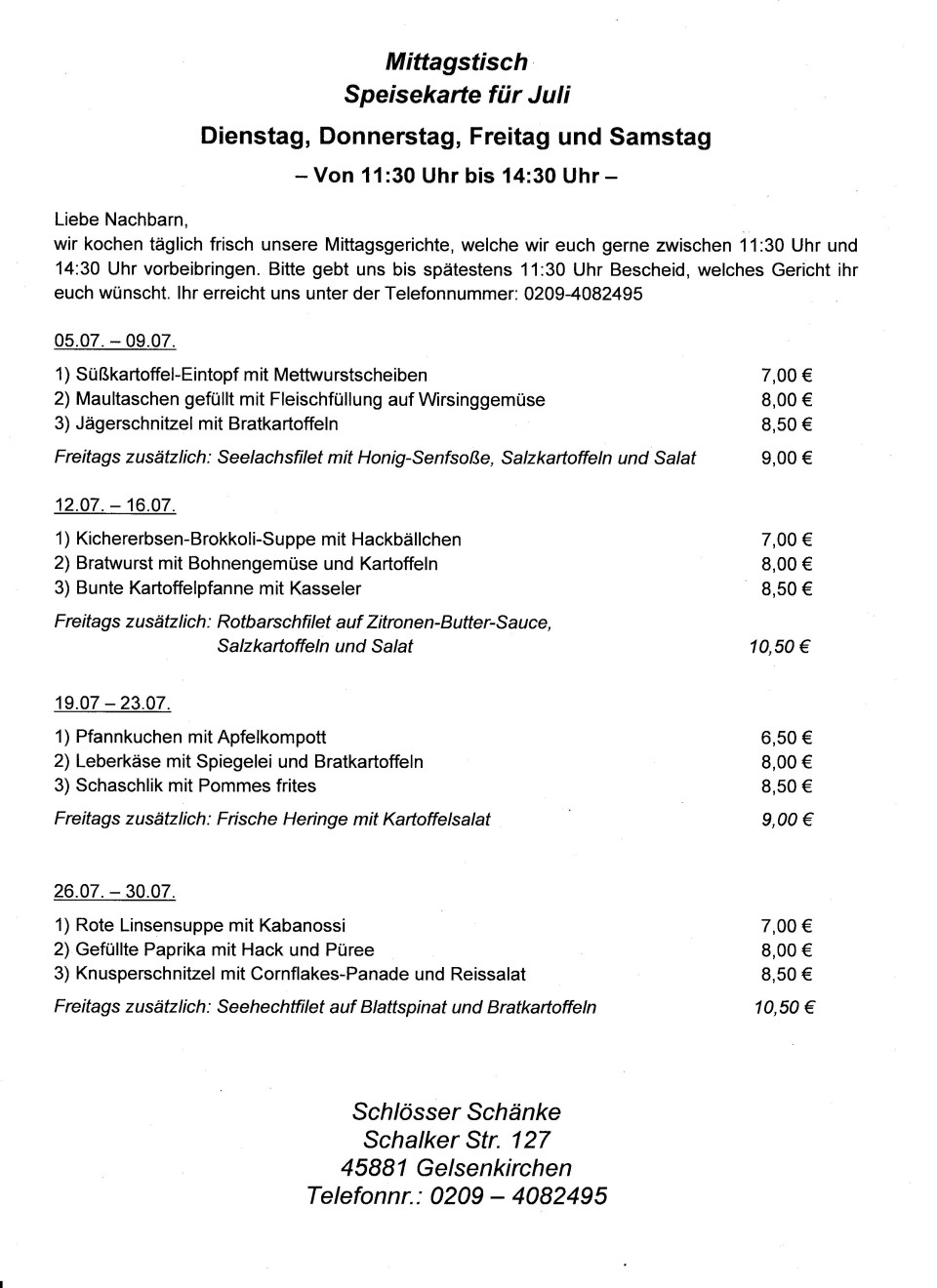 Schlösserschänke Mittagstisch mit Lieferservice 0722