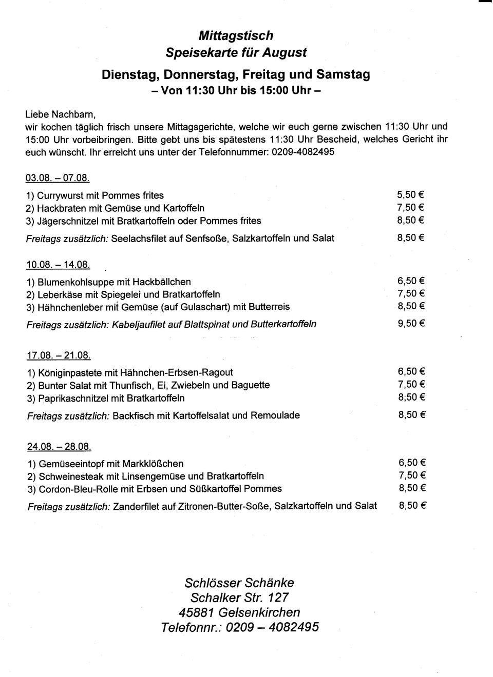 Schlösserschänke Mittagstisch mit Lieferservice 0821