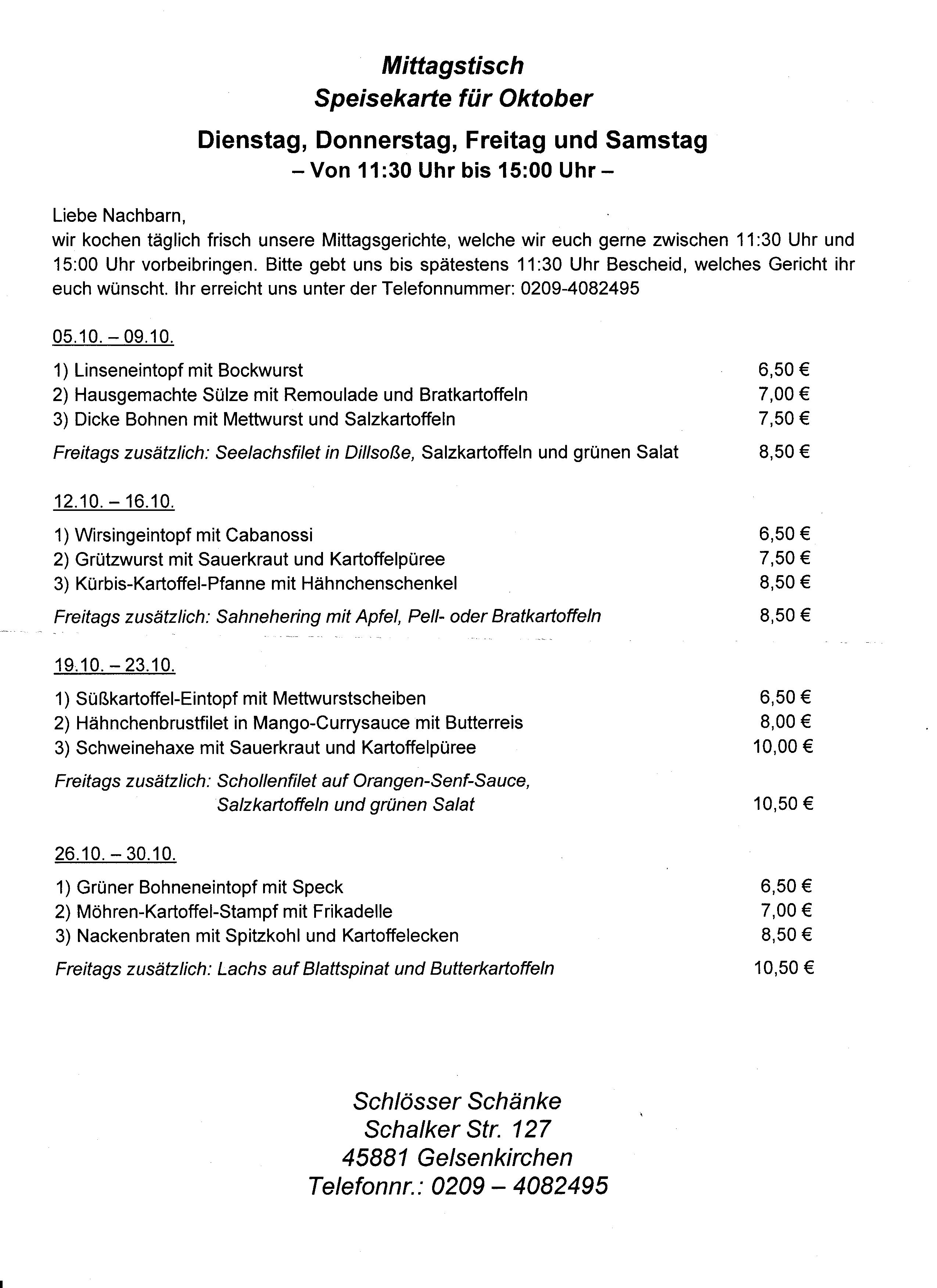 Schlösserschänke Mittagstisch mit Lieferservice 1021
