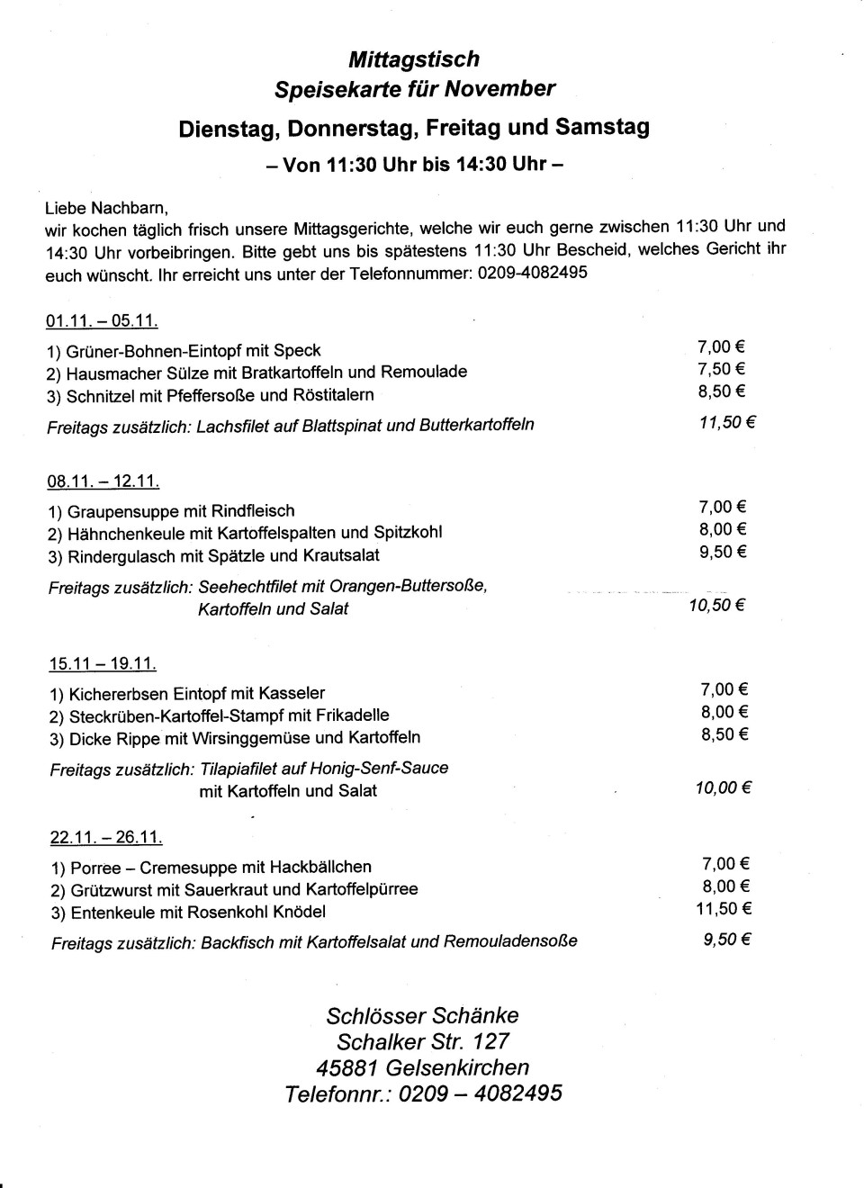 Schlösserschänke Mittagstisch mit Lieferservice 1122