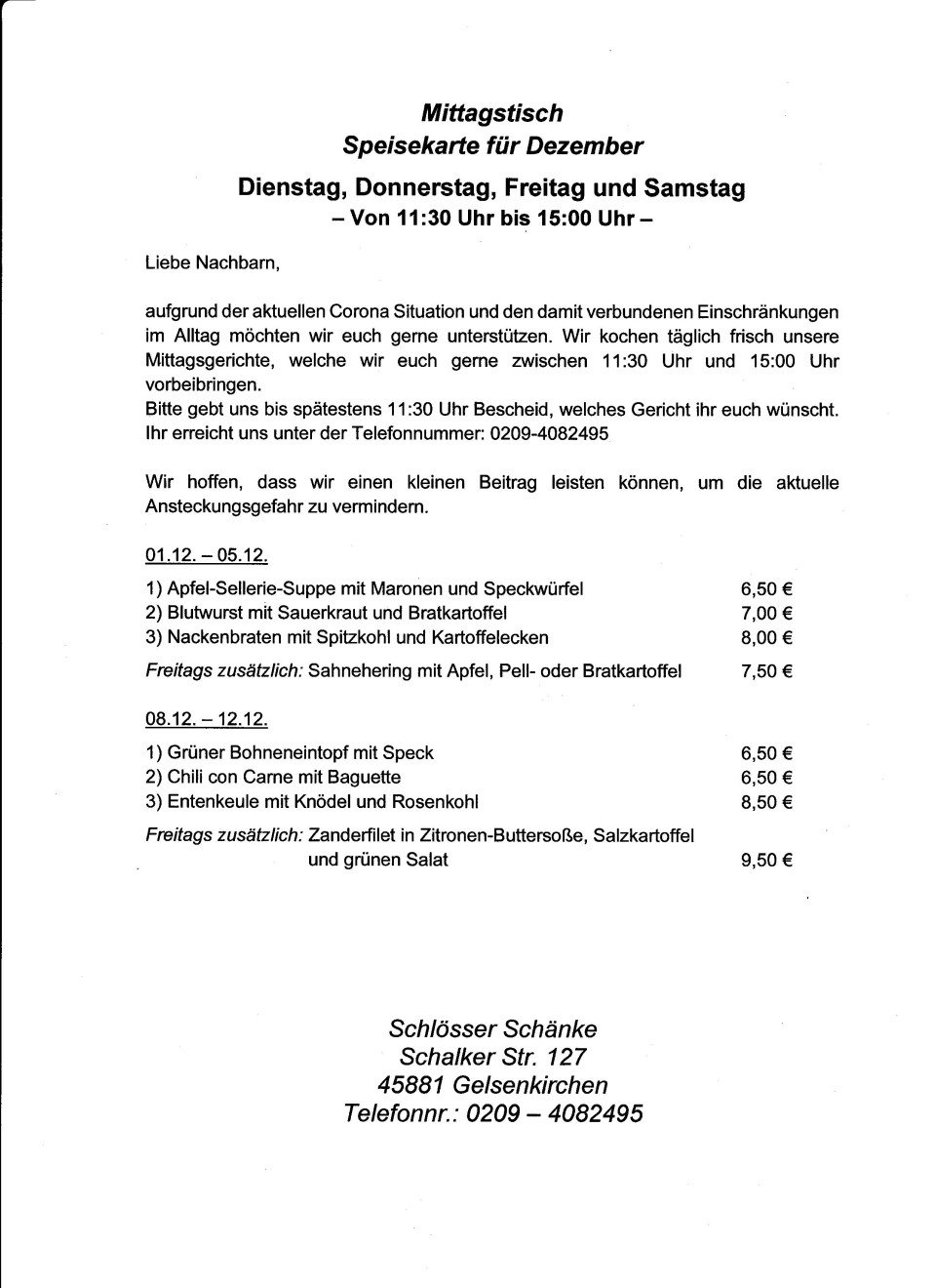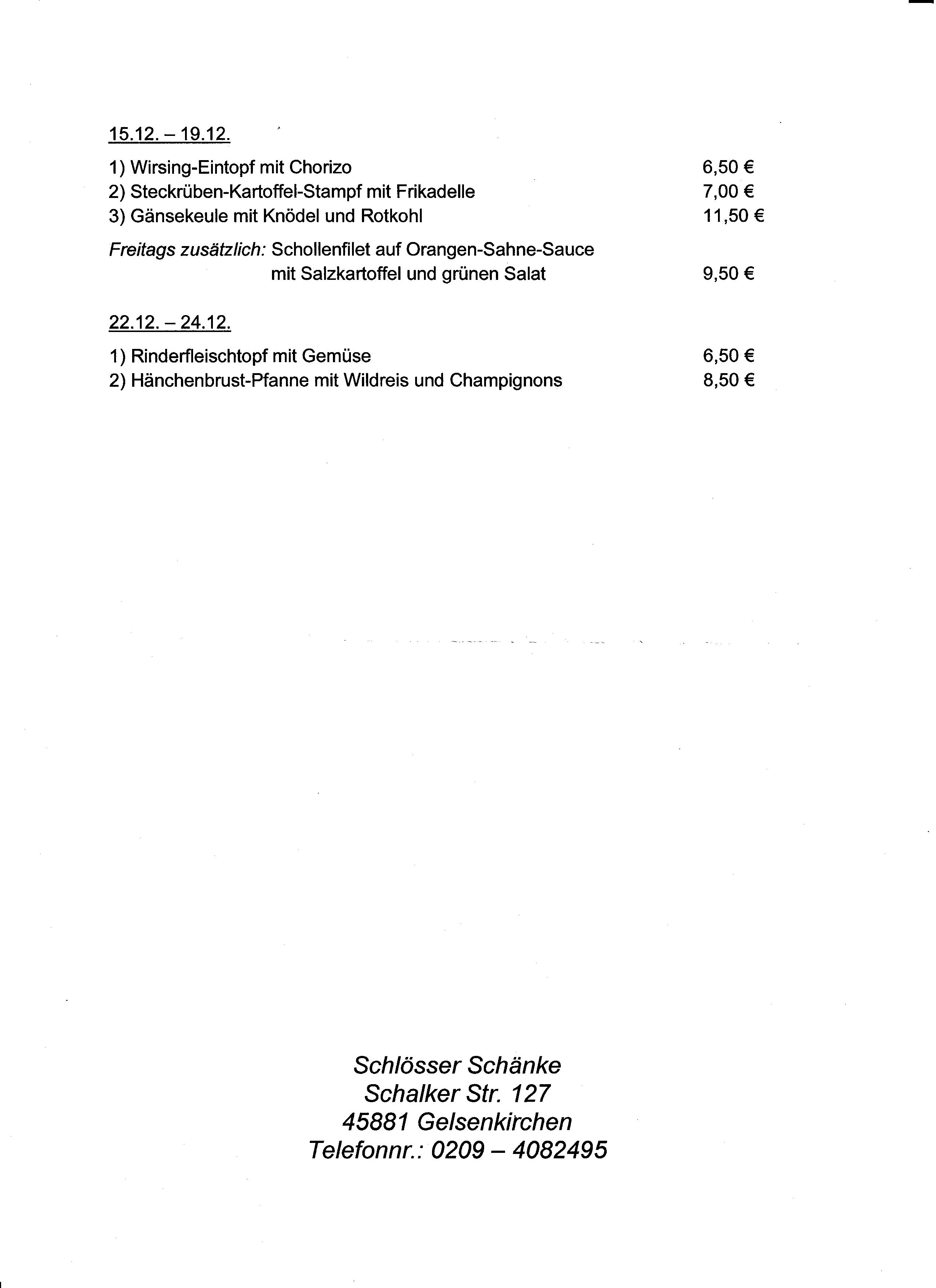 Schlösserschänke Mittagstisch mit Lieferservice Dezember
