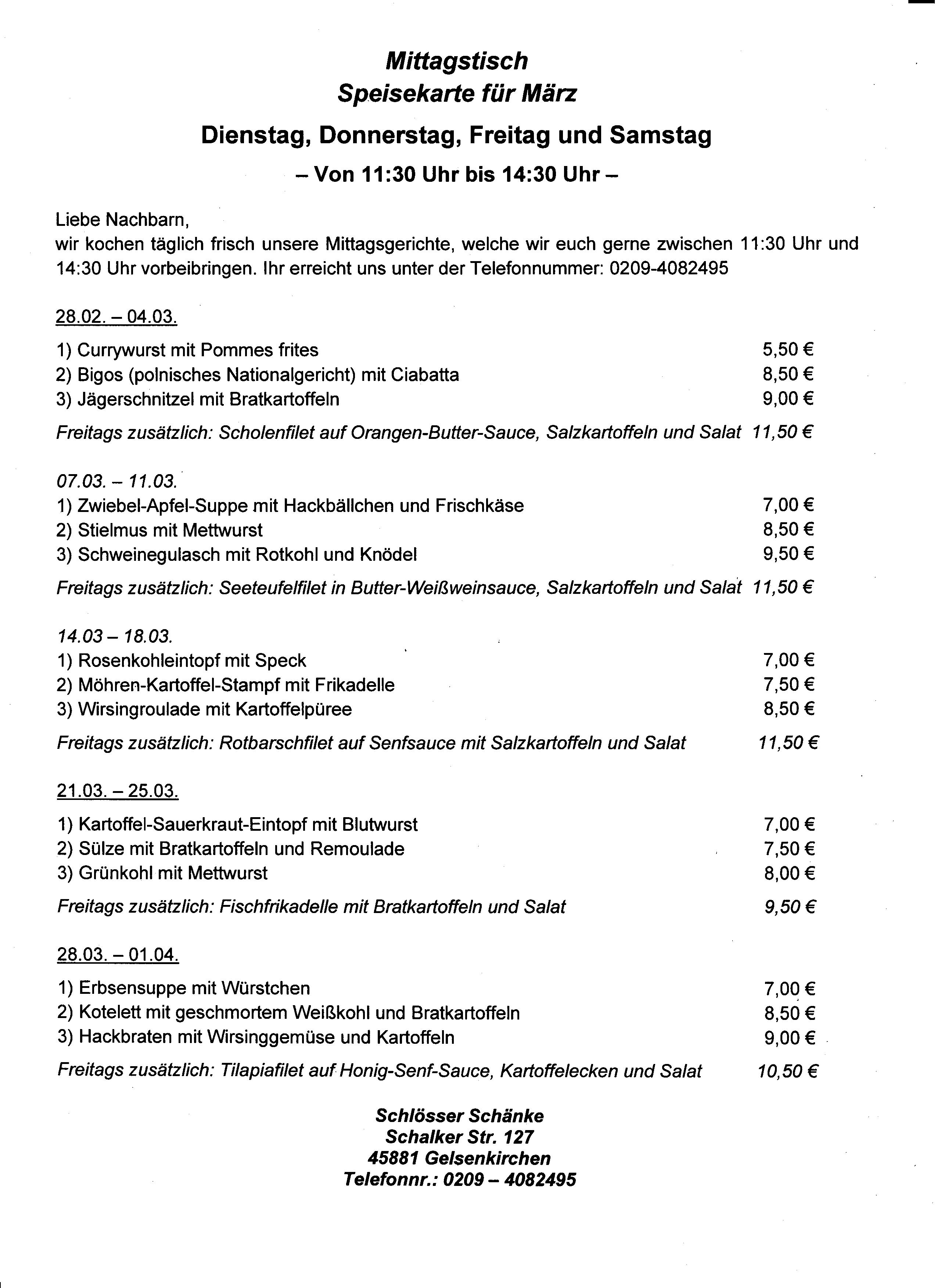 Schlösserschänke Mittagstisch mit Lieferservice 0323