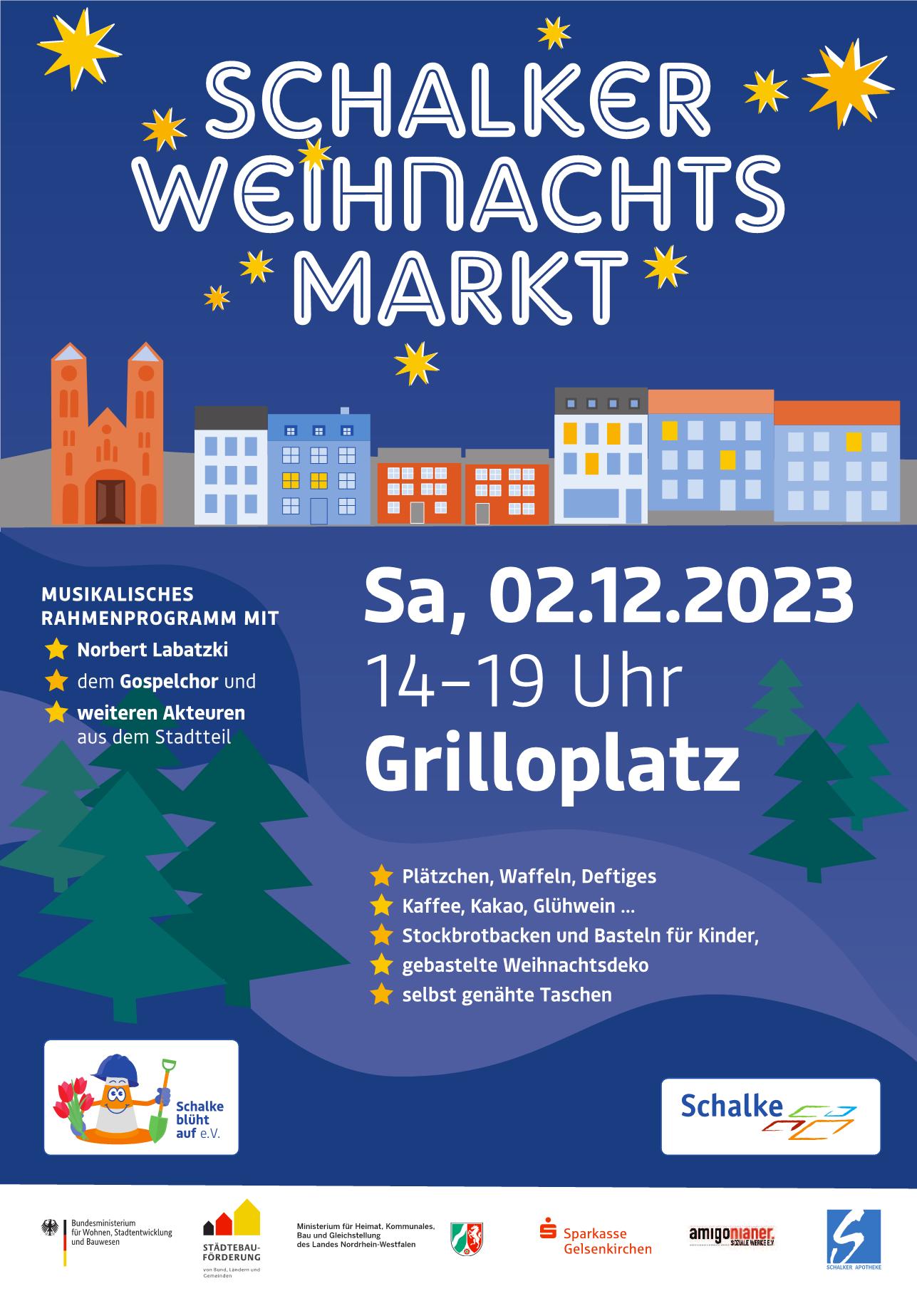 Schalke blüht auf e.V., die Amigonianer und das Stadtteilbüro Schalke laden zum Weihnachtsmarkt am 02.12.2023 von 14:00 Uhr bis 19:00 Uhr auf den Grilloplatz ein.